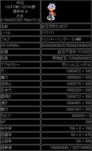 Lv1111111突破♪ チャンプ戦でディアボロ跳ね返しされて死亡;;まさかの事故でした・・・ アクセが大破しただけでよかった^^ 防具を立て直す自信ないです(ワラ 鉱石:火水気邪白闇火水火