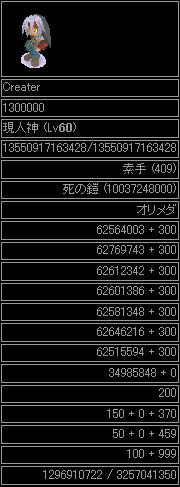 気ひび割れた宝珠気ひび割れた宝珠闇の順に拾った(笑 その後チャンプ戦で邪GET!! 白がちょい貯まったので????武器の続きを・・ ?????白魔石白魔石白魔石白魔石白魔石白魔石白魔石白魔石 能力:33333300000000 命中:814 あと(白魔石)×2で3.33333e+15になるーー!! 酒のLv1300000突破ー! 鉱石:闇白水火気気闇邪邪